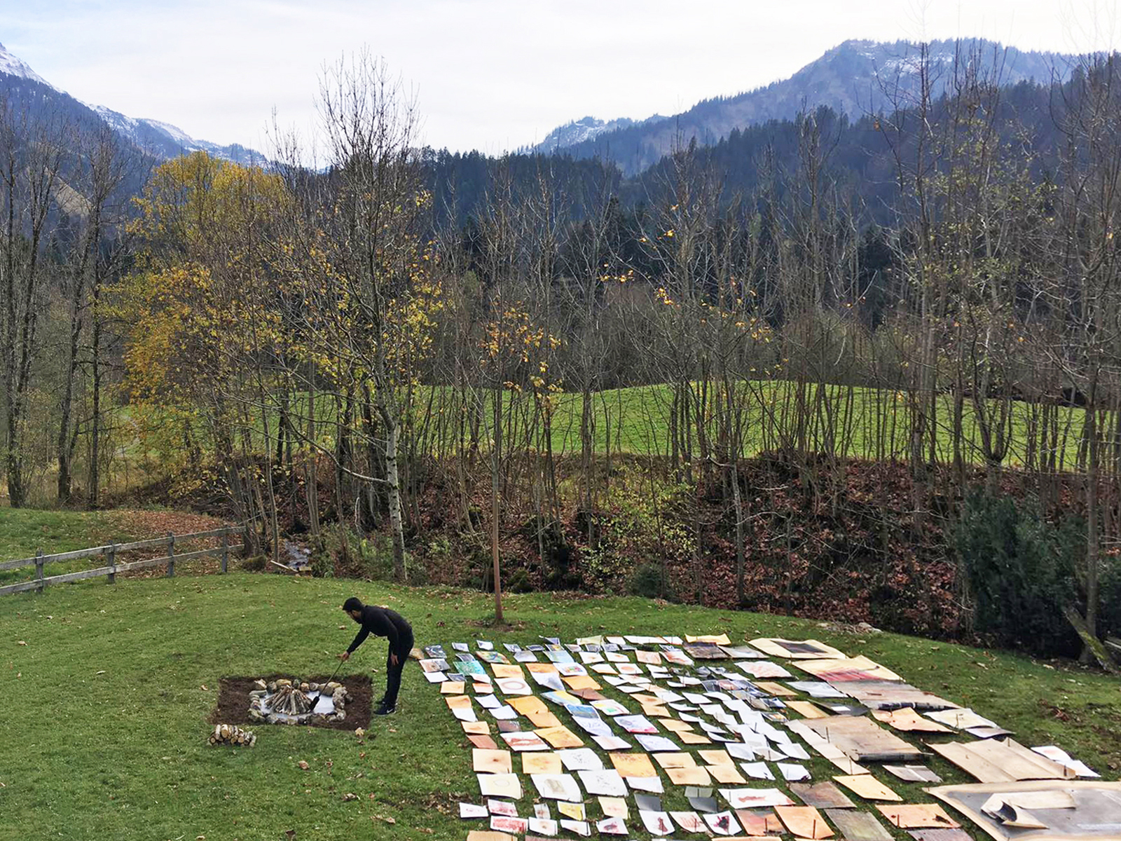 Los cuadros de Luca Benites extendidos sobre la tierra de Ebnit (Austria) se ordenan como los años -yuxtapuestos y en estricto orden-, y con el mismo rigor geométrico que aplica a su trabajo. Es el tiempo lo que cubre la tierra. Un fuego acompaña la extraña escena. La hoguera está en el centro de un pequeño hoyo cuidadosamente cavado en el terreno, como eco del cuadrado que dibujan las obras sobre la hierba. Recuerdo que Luca y yo hablamos sobre el rito que estaba proyectando. De la misma manera que hay una familia secreta de “escritores del no”, hay, entre los artistas, aquellos que destruyen su obra para poner su cronómetro a cero. Pero Luca es un miembro curioso de esa tribu. No se despide de su trabajo; antes bien, lo transforma y lo reformaliza. Elige -como instrumento- la materia del tiempo trocado en ceniza.