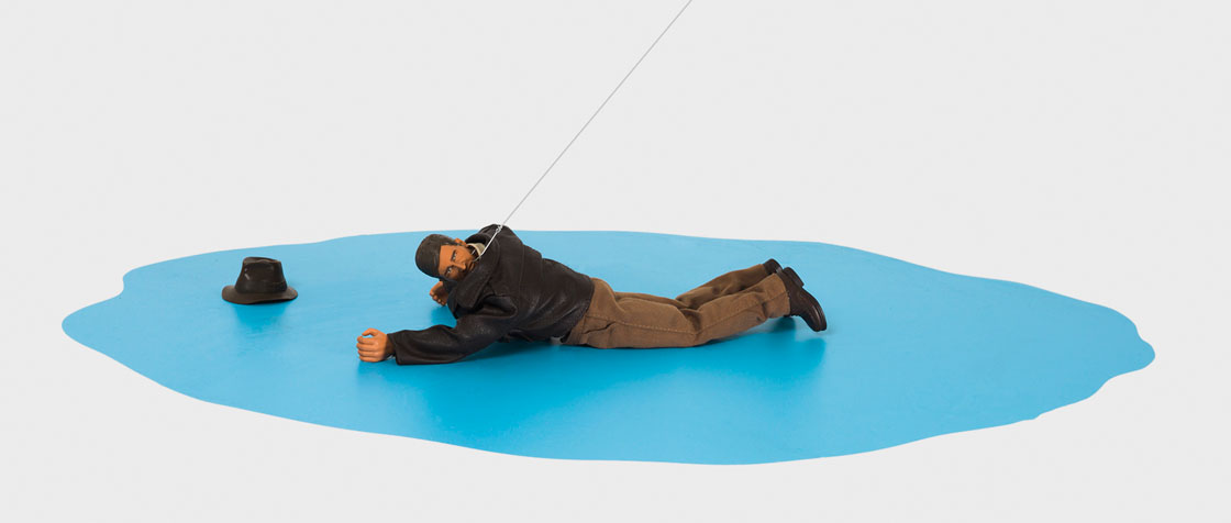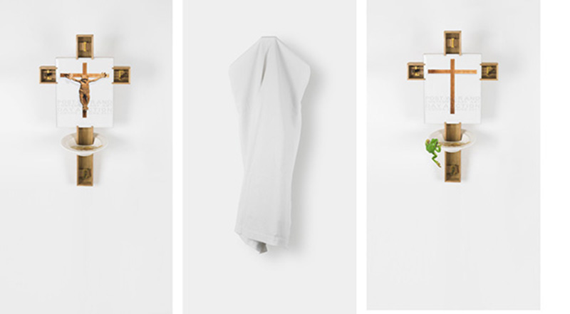 Rodriguez work method is consistent of works in series. The Christie’s, Life of Death photographic triptychs investigates different outcomes for in each sculpture intervening the dominant elements of each composition. Roles and power schemes are inverted as new outcomes are proposed by the figures trapped in each environment. Each sculpture is concealed with a white cloth that marks the transition of the narrative and a message on human morality.