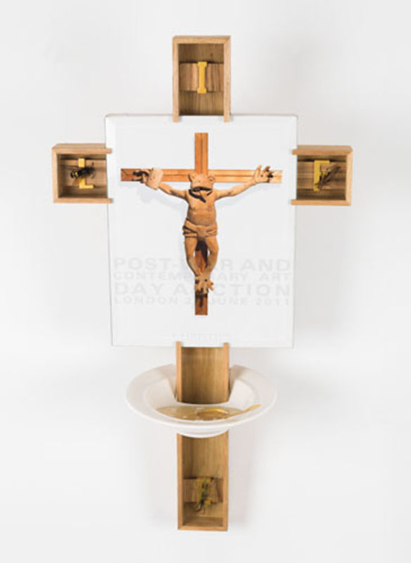 Digital print on cotton paper ed 60 x 108 cm 1/5 ed 156 x 180 1/3 Wooden cross sculpture with metal letters three insects , resin soup, catalog.