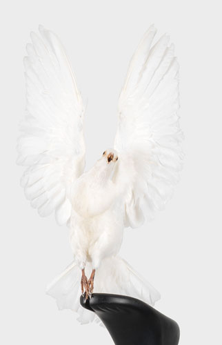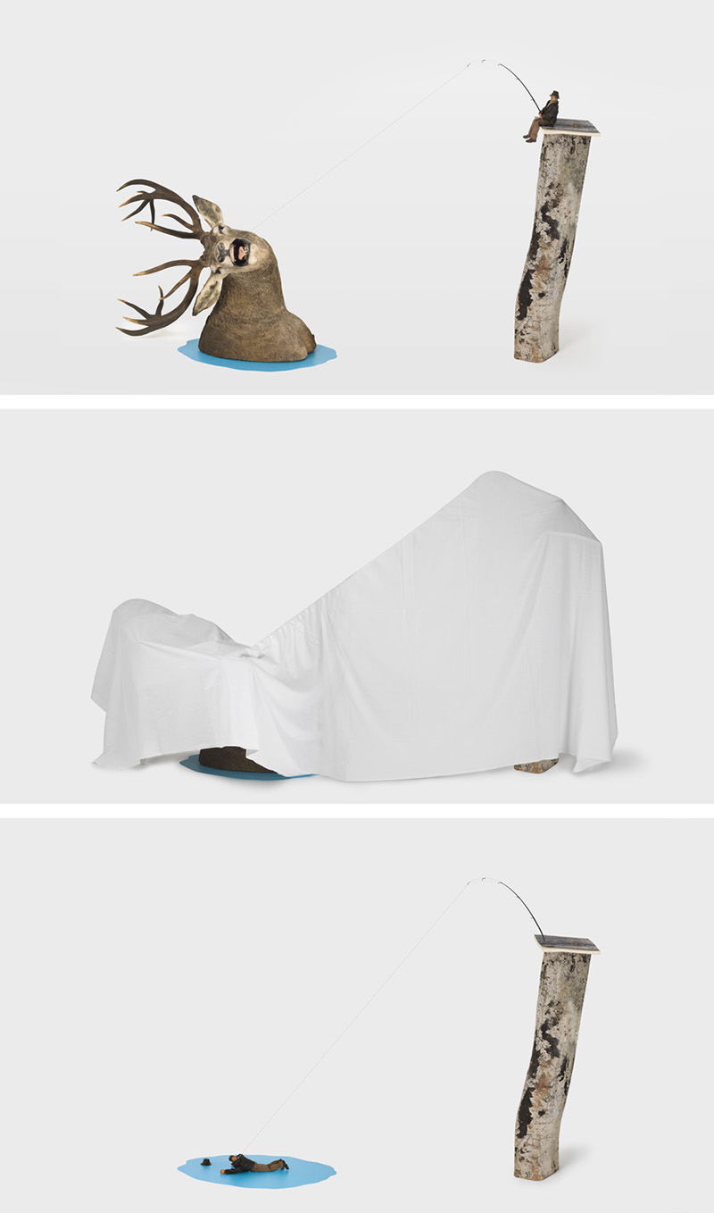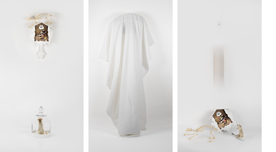 The Christie’s, Life of Death photographic triptychs is the continuation of the narrative Rodriguez addresses in each sculpture, playfully question logical power schemes and invert the roles of the trapped and the trapper, when each sculpture is concealed with a white cloth, as though by magic the elements are transformed. When the sculptures are revealed in the last photograph of the series the composition changes, revealing new stories and new alternative to the power roles originally presented.